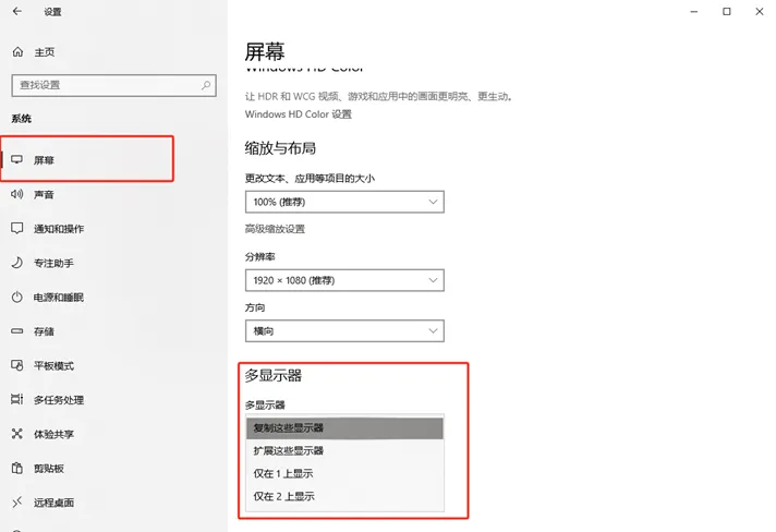 在多顯示器選項選擇“復(fù)制這些顯示器”即可實現(xiàn)雙屏同顯,如下圖所示: