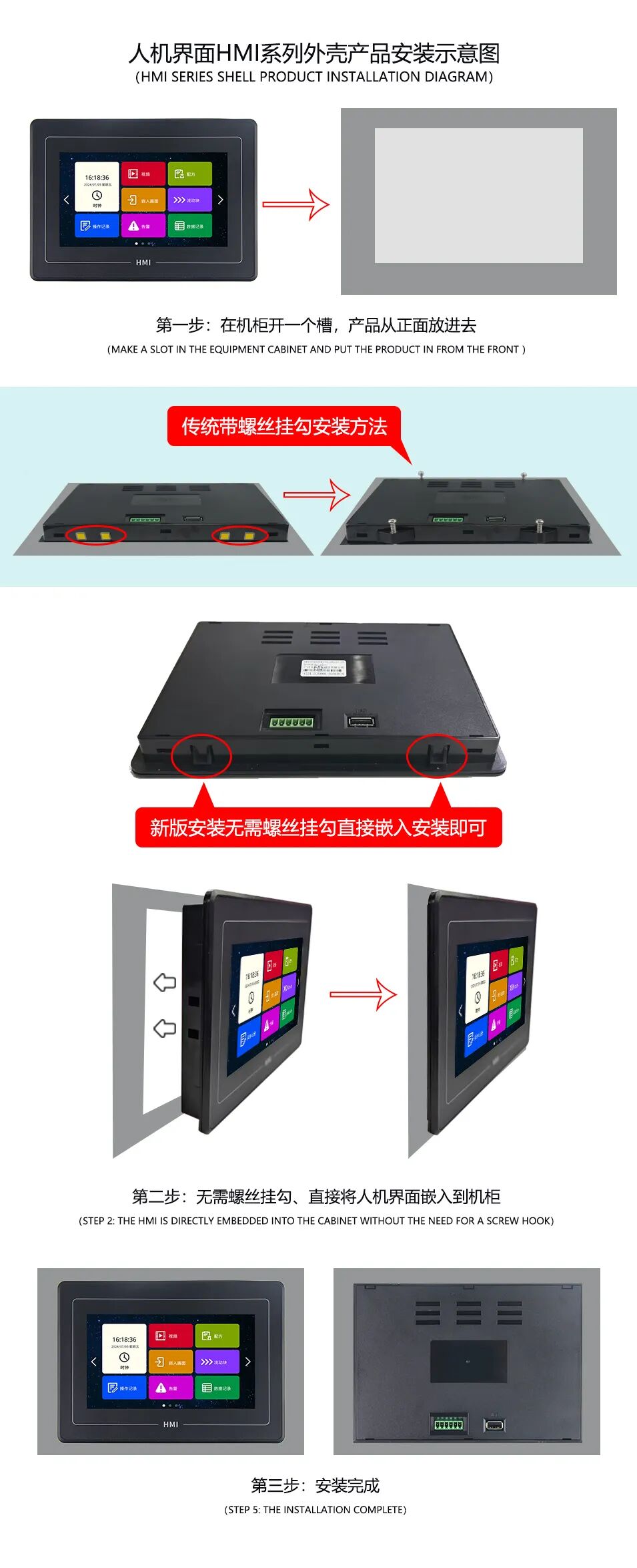 在安裝方面,針對機械和工控行業(yè)的機柜設備,新外殼進行了重新設計并全面升級,取消了傳統(tǒng)的掛鉤螺絲安裝結(jié)構(gòu)自帶卡扣掛鉤件,只需要把產(chǎn)品對準開窗位置按壓進機殼既可鎖緊串口屏,實現(xiàn)無螺絲卡扣式安裝,從而大幅提高設備安裝效率。